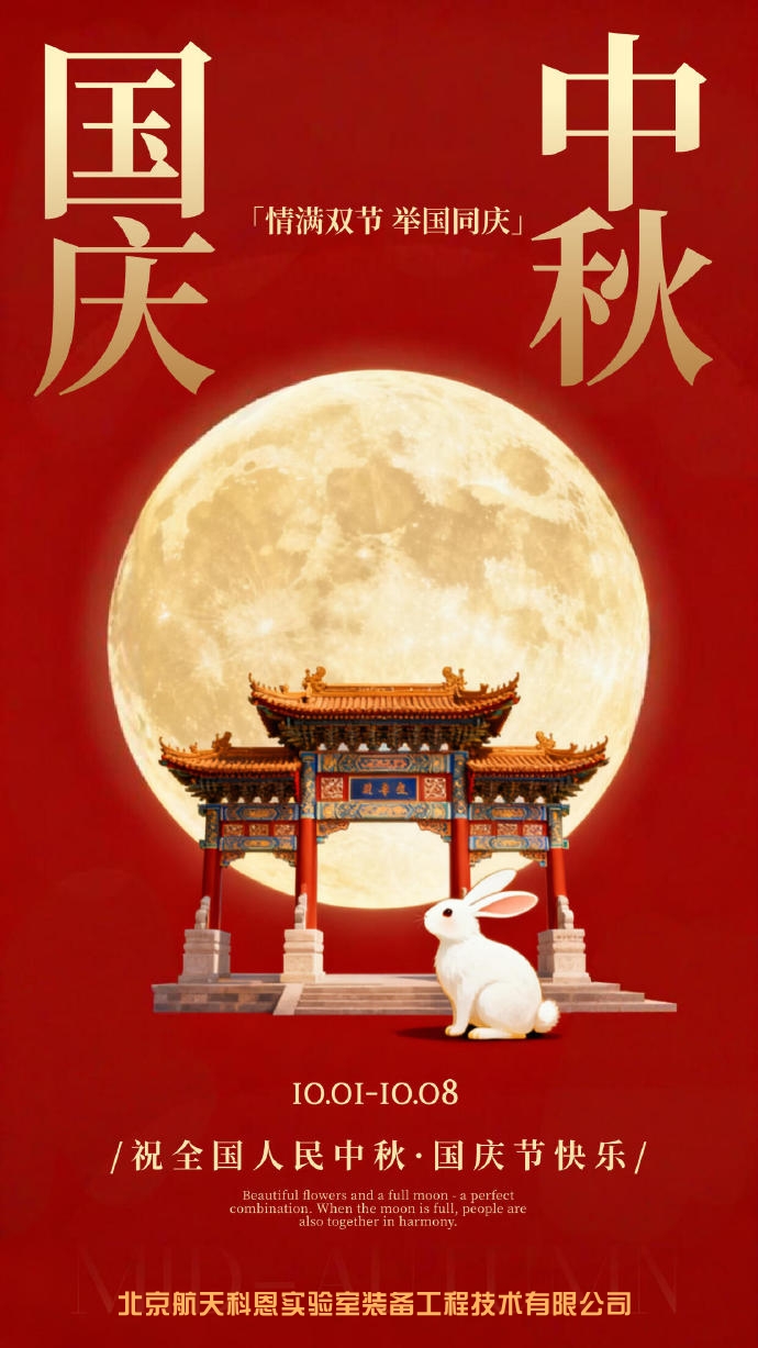 月滿(mǎn)中秋,家國(guó)同慶。在 2025 年中秋與國(guó)慶雙節(jié)來(lái)臨之際,北京航天科恩實(shí)驗(yàn)室裝備工程技術(shù)有限公司向您致以最誠(chéng)摯的節(jié)日問(wèn)候!感謝您長(zhǎng)期以來(lái)對(duì)我們實(shí)驗(yàn)室裝備工程建設(shè)、技術(shù)服務(wù)及運(yùn)維保障工作的信任與支持。?